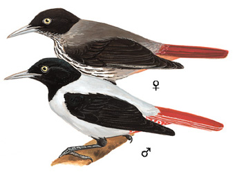 区别辨识:雄性鹊色鹂的背部和腹部的骨白色与任何其他黄鹂不同,雌鸟背部的灰棕色与黑色头部形成鲜明对比。与朱鹂相似,但总体更暗更棕。
