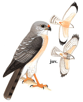 区别辨识:与日本松雀鹰相似,但赤腹鹰的翼下横纹较淡,成鸟的翼尖黑色更加突出。幼鸟虹膜颜色可能为柠檬黄,而日本松雀鹰幼鸟虹膜为黄色。