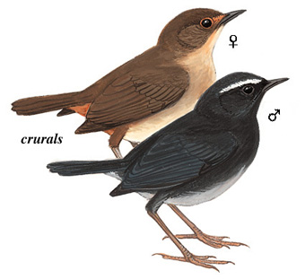外形特征:中华短翅鸫雄鸟体色为蓝灰色,下腹和尾下覆羽颜色较浅,头部有明显的白色眉纹。雌鸟全身覆盖着深棕色的羽毛,腹部颜色较淡,眼周有一圈隐约可见的锈红色眼环。两性体型中等,翅膀短小。