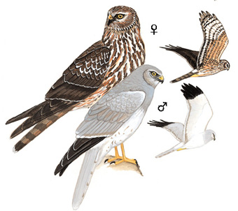 外形特征:白尾鹞体长42-50厘米,翼展100-121厘米,雄鸟体重300-400克,雌鸟370-708克。雄鸟整体呈灰色,具白色臀部,翼尖黑色,腹部浅色。雌鸟和幼鸟为深棕色,胸部有条纹,翼下覆羽无赤褐色横斑。幼鸟与成鸟相似,但颜色稍暗。