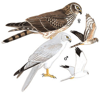 外形特征:成年草原鹞体型中等,长度约40-48厘米,翼展可达95-120厘米。雄鸟体重约315克,雌鸟略重,平均445克。雄鸟上部呈灰白色,下部白色,翼尖有明显的黑色。雌鸟和幼鸟的上部棕色,腹部为带有棕色条纹的浅黄色,头部有清晰的面部图案,这有助于与其他鹞类的鉴别。