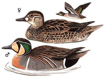 外形特征:雄性花脸鸭身长39-43厘米,体重360-520克;雌鸟稍轻,体重402-505克。翼展可达65-75厘米。比白眉鸭略大,翼和尾较长。雄鸟具独特面部花纹,绿色后颈,黄色和黑色耳罩,暗冠,粉色胸部带斑点,下垂的红白肩羽,灰色侧身,带有黑色条纹。雌鸟整体褐色,喙基部有白色斑点,胸前有垂直白色条纹,眼线深色。幼鸟似雌鸟,但面部图案不明显,下体有褐色斑点或条纹。