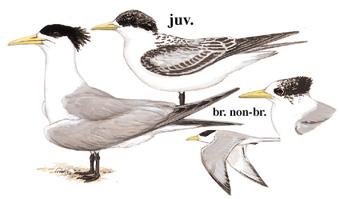 区别辨识:与橙嘴凤头燕鸥相比,体型更苗条,上体颜色更深,喙色偏冷黄而非橙色,且有更陡峭的颌角。与小凤头燕鸥相比,体型更大,喙更长,黄色更深。