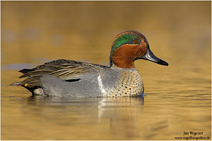 外形特征:雄性美洲绿翅鸭具有灰色的侧身和背部,黄色的臀部,翅膀上有明显的白边绿色翼斑。头部呈栗色,眼周有绿色斑块。雌鸟和雌性绿翅鸭相似,呈淡褐色,但通过大小、形状和翼斑可辨认。在非繁殖季节,雄鸟会换上更接近雌鸟的羽毛。