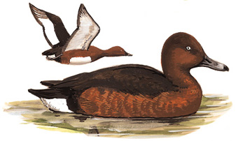 白眼潜鸭(英文名:Ferruginous Duck,学名:Aythya nyroca),是雁形目鸭科潜鸭属的鸟类。俗名: 白眼凫,中型潜水鸭,主要分布在欧亚大陆的西部至亚洲中部,以及非洲北部。雄鸟头部、胸部和两胁为深栗色,尾下覆羽纯白,雌鸟较暗淡,眼睛颜色不同。繁殖于浅水湖泊、沼泽地带,冬季迁徙至较大湖泊、河流和海湾。胆小机警,主要以植物性食物为主,兼食水生动物。