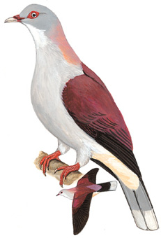 外形特征:山皇鸠体长43-51厘米,拥有长尾、宽大的圆形翅膀和缓慢的翼拍。头部、颈部和下体为淡紫色灰色,与白色的喉咙形成对比,背部和翅膀呈棕色至紫红色。上体部分可能较暗淡。下翼为灰色,尾巴黑色带有一条灰色横线。雄雌相似,幼鸟的色彩较为暗淡,头部至胸部呈灰色(而非淡紫色),翅膀和背部为土褐色,翅膀尖端为栗色,背部和臀部为烟灰色。
