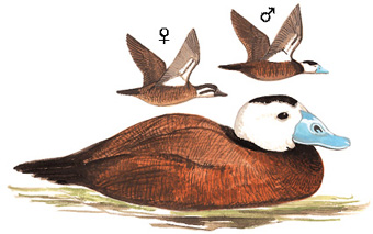 区别辨识:与棕硬尾鸭相似,但可通过头部形状、更健壮的铅灰色喙和不同的体型大小加以区分。雌性白头硬尾鸭与红头鸭相比,体型更小,更灰暗,尾部更短,体态更为浮肿。