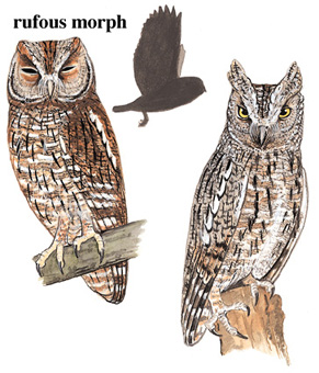外形特征:西红角鸮体长19-21厘米,翼展47-54厘米,体重60-135克,存在灰色和红棕色两种色型。面部盘灰色,眼周较暗,具细白眉纹;头顶、耳羽簇和上体呈灰褐至红褐色,饰以黑色条纹、斑点和网纹;背部两侧更偏红;肩部有一行黑尖白点;翅膀外侧羽片宽幅淡色横斑,尾部窄幅横斑;下体浅棕至淡黄色,饰以深褐色条纹、细斑点和网纹。虹膜黄色,喙蓝黑色,腿明显纤细,覆以淡白色羽毛,脚灰色。