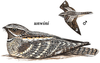 区别辨识:与红颈夜鹰相比,欧夜鹰体型较小,颜色较暗,翼展更短,白翼斑较小,红颈夜鹰有更明显的淡黄色颈圈和翅膀、尾部的白色标记更明显。与非洲的棕颊夜鹰和乌夜鹰相比,欧夜鹰颜色较浅,斑点较少。