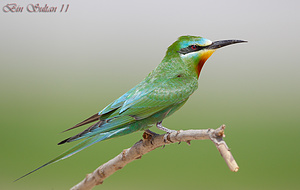 区别辨识:与栗喉蜂虎相比较,蓝颊蜂虎的眼周蓝色区域较小,尾部橙色喉斑更大,脸颊蓝色更宽广。