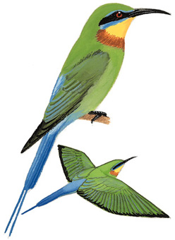 外形特征:成年栗喉蜂虎通体绿色,蓝尾突出,脸带窄蓝斑及黑眼纹,喉部及脸颊为栗红至棕黄色,腹部绿色,尾羽下覆羽蓝色。虹膜深红色。雌雄外观相似。幼鸟色彩较淡,喉部棕黄,尾部较短,无成鸟的长尾羽,头部与身体边缘白色。成鸟尾羽中央两根特别延长。