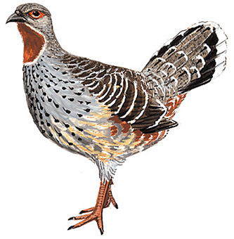 外形特征:红喉雉鹑整体呈棕色,头部略尖,喉部为深栗色,眼睛周围有鲜艳的红色裸皮。羽毛图案复杂,胸腹部有精致的黑色斑点,翅膀和侧翼边缘白色。雄鸟具有单个的刺,雌鸟则可能缺少环绕栗色喉部的淡色环。幼鸟特征未充分描述,但已知有小型淡褐色喉斑,无环状标记。