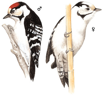 外形特征:小斑啄木鸟体长14至16厘米,体重16至26克,雄鸟具有带有淡黄色调的白色前额和眼先,头顶鲜红,被细窄的黑线环绕,颈后和颈背黑色;头部其余部分,包括下巴和喉咙,为白色或近白色,有黑色颊纹在颈部侧面展开并延伸到上胸侧;上体黑色,下背至臀部有宽白条纹,翼羽有宽白色斑点或条纹接近尖端;黑色飞羽宽幅白色横斑;上尾羽黑色,外羽白色带2至3道暗色横纹;下体白色略带淡黄色调,胸侧和胁部有细黑纵纹,尾下覆羽常有黑色斑点;喙短而尖,暗灰色至黑色,下颚基部较浅;虹膜红褐色或棕色;腿绿色。雌鸟头无红色,前额白色或淡黄白色,头顶两侧和后部黑色。幼鸟比成鸟暗淡,黑区带棕色,苍白前额斑被较暗的尖端遮掩,下体条纹更重但暗淡且定义不清,雄鸟前额灰粉红色,雌鸟前额被暗尖端遮盖,通常有几根红色尖端。