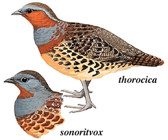 区别辨识:与灰胸竹鸡的区别在于头部的锈色仅限于下巴和喉咙,下胸部至尾下覆羽颜色更深,具有更大范围的栗色斑点,上体颜色较深,翼覆羽上的白色斑点较少较小。