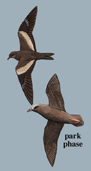 区别辨识:与其他暗色海燕相比,日本叉尾海燕的主羽基部有显著的白色,尾部深叉,翅膀看似远置在身体前方,给人一种无颈的感觉。与黑叉尾海燕相比,体型较大,飞行风格更显笨拙;与褐翅叉尾海燕相比,缺乏主羽基部的白色,通常对比度较低的腕斑。