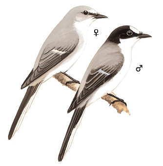 外形特征:灰山椒鸟体长约18至21厘米,体重约20至28克。雄鸟头部前额白色,窄黑额带,从眼上方至颈后黑色,耳羽黑色,延伸至后头和颈背;头部侧面和颈部半环白色;背部、翅膀初级飞羽覆盖羽均匀钢灰色;次级飞羽和三级飞羽覆盖羽烟黑色,边缘钢灰色;中央尾羽黑色,其余尾羽黑色具宽白色端斑;下巴、喉部及腹部纯白色,翼下覆羽灰白相间。雌鸟头部灰色,除眼上方和额部,下体较淡的白色。幼鸟上体烟色,翼羽边缘白色,胸部两侧和两胁细密模糊的淡灰色横斑。
