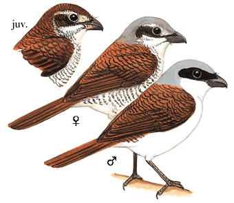 区别辨识:与牛头伯劳及红尾伯劳相比,虎纹伯劳头部的灰色更明显,且无明显的黑色贯眼纹。幼鸟的暗色斑点更为显著。成鸟的歌声和叫声也有区别。