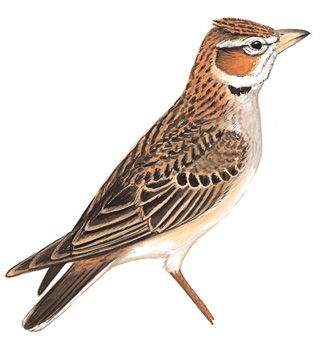区别辨识:与草原百灵和双斑百灵相比,长嘴百灵头部图案对比不那么强烈,但整体花纹更明显。飞行时,白色尾缘和背部翼缘尤为突出,而草原百灵仅在尾尖有少量白色,双斑百灵则在翅膀和尾巴上均无白色。