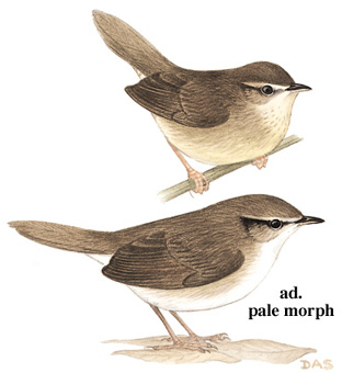 区别辨识:与斑胸短翅蝗莺相比,中华短翅蝗莺体形略显修长,尾巴相对更长,嘴和初级飞羽稍长,羽色更为朴素,尤其是下尾覆羽。雌雄外观相似。