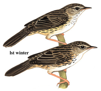 区别辨识:与黑斑蝗莺相比,矛斑蝗莺体型更小,上体和胸部的条纹更粗重,顶冠颜色更深。