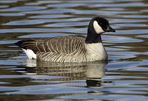 外形特征:小美洲黑雁是一种小型、健壮的雁类,具有短颈和深而短的喙。羽毛颜色与加拿大黑雁相似,头部和颈部黑色,除了显眼的白色下颌带("chinstrap"),有时被一条黑色的下颌线打断;颈部的羽毛平滑。上体和翅膀灰褐色,尾部黑色,腹部棕色,两侧和侧腹通常较暗。白色的下颈环或项圈仅见于某些亚种。眼睛深褐色,喙、腿和脚均为黑色。