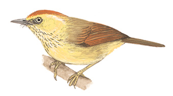 外形特征:纹胸鹛是一种小型、强喙的鶲,背部呈棕色,头冠栗色,腹部浅黄色,胸部有细窄的黑色条纹。成鸟虹膜呈黄白色至灰褐色,眼周皮肤蓝灰色;喙暗色,下颌较浅;腿灰橄榄色。雌雄相似,幼鸟腹部比成鸟更白,条纹较弱。各种亚种在颜色和条纹上有细微差异。