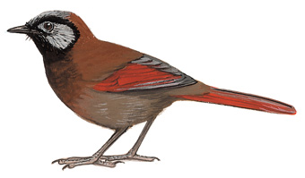 外形特征:丽色噪鹛体长约27至28厘米,羽毛主要呈棕色,翅膀和尾巴上有醒目的红色区域。头部的冠和耳羽呈灰色,带有黑色条纹,喉咙部位颜色较暗。喙和脚均为黑色。与之相似的红尾噪鹛相比,丽色噪鹛的头顶呈灰色,背部和胸部颜色更深。