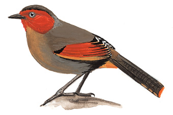 外形特征:灰头薮鹛体型中等,色彩鲜艳。头部灰色,面部和翅膀上的斑块呈现醒目的红色,身体其余部分为棕褐色,眼上方有一条黑色眉纹。雌雄鸟的羽毛颜色相似,幼鸟的色彩可能较为暗淡。
