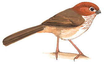 外形特征:褐翅鸦雀长约12-13厘米,体重8-13克(雄鸟)和6-10克(雌鸟)。具亮栗色的冠羽至背部,与温暖的暗棕色上体形成对比。上翼和尾羽与上体相似,初级飞羽边缘灰白至淡黄褐色。喉部和上胸酒红色,带有更深的栗色条纹,与苍白的腹部明显分界,其余下体淡黄褐色。眼睛棕色,繁殖季节变为红棕色。喙呈黄褐色到白色,嘴峰黑色;腿灰色至淡橄榄色。幼鸟上体较暗,更偏赤褐色,下体更淡黄色,条纹不明显。