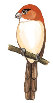 外形特征:体长约15厘米,头部较大,冠部明显尖突,喙短而厚实。头顶至颈背呈亮锈色,与上体温暖的橄榄棕色融合;眼周淡蓝,有明显的黑色眉毛;上翼深褐,飞羽和次级飞羽有锈色边缘;下体温暖的淡黄色;虹膜红褐色至亮红棕色;喙粉红色,脚淡蓝灰或铅灰色。
