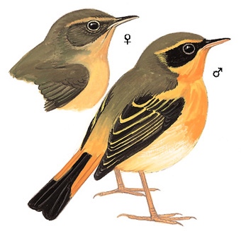 外形特征:雄性金色林鸲背部呈橄榄褐色,拥有亮丽的橙黄色下体,头部有醒目的金色眉纹。雌鸟色彩较为暗淡,缺少黑色面罩,上体橄榄色带金色,下体淡橙色。幼鸟呈深棕色,具斑驳条纹。两性均在尾巴两侧有黄色斑块。