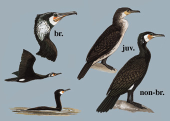 区别辨识:与北美同属的角鸬鹚相比体型更大,颈粗嘴厚,面部黄色裸露皮肤周围具白色羽毛边缘;繁殖期具白色大腿斑及头颈丝状羽,而角鸬鹚具双道黑色丝状羽。亚成鸟下体白色范围通常大于角鸬鹚。