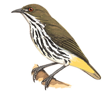 外形特征:黄臀啄花鸟体型小巧,约9-10厘米长,雄鸟体重9.1-10.1克,雌鸟9克。雄鸟具亮橄榄绿色的冠羽和颈侧,背部亦为橄榄绿色,翼和尾呈黑色。其喉部白色,有灰色黑边的颊纹,胸部和腹部为奶油白色,带黑色条纹,最明显的特征是其黄色或橙色的臀部。雌鸟相似,但色彩略淡。幼鸟上部较暗,下部更灰,条纹更细且灰褐。眼睛橙色或橙红色,喙暗灰色或黑色,腿深灰色。