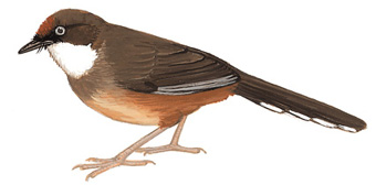 外形特征:中等体型(约28厘米),暗褐色的白喉噪鹛,拥有白色的胸部和红褐色的下体,尾尖宽大且白色明显。额头至眼睛呈暗赤褐色,冠羽和背部带橄榄褐色,翼上覆羽和中央尾羽类似,而内侧初级飞羽边缘为橄榄灰,外侧初级飞羽边缘淡灰色,尾羽外侧有大胆的白色尖端和较深的次端斑点。嘴角黑色,下颌黑色,喉至上胸白色,胸带褐色,与上体颜色连续但稍浅和偏灰,两侧胸部更宽,与白色部分界限分明,其余下体呈橙黄色。虹膜呈暗白色至蓝灰色,面部皮肤铅灰色。喙角质褐色至黑色,有时尖端较浅;腿呈蓝灰色至脏石板色。两性相似,幼鸟上体比成鸟更暖色,前额少赤褐色,眼周皮肤绿黄色或橄榄绿色,胸带不那么明显,腹部中部白色,喙黑色橄榄色,上部较深,口角橙黄色,裂口黄色。