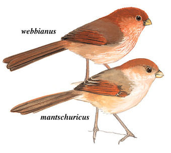 区别辨识:与灰喉鸦雀和褐翅鸦雀有亲缘关系,部分学者视为同种。在与灰喉鸦雀分布重叠区,两物种有时混群,偶见杂交个体。各亚种主要在色调上差异:suffusa亚种比指名亚种略鲜亮,头顶至最上背部更栗红,上体色调稍冷/暗,下体可能略暖且酒红色更浓;elisabethae与前者相似,但前额至最上背部略深且更栗色,喉及上胸较暗淡且条纹不明显,腹部更偏乳黄色(喙 described 为暗灰色,腿为蓝灰色污粉色或带红褐色暗灰色);bulomacha外观亦极相似,但喙显著较大(supposed 为头部侧面较浅玫瑰色与粉红栗红色头顶形成对比,喉部极淡,检视标本中不明显);fulvicauda下体粉红色photo 略强,延伸更向下至腹部,后颈红褐色可能更栗色且可能延伸更上至背部;mantschurica总体明显较淡,头侧及喉部条纹不明显,下体粉红色较弱。