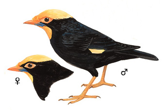 外形特征:体长19-21厘米,体重78-99克。成年雄鸟头顶金黄色,雌鸟的黄色区域较窄,仅限于下巴中央条带。全身黑色,带有紫色光泽的脸侧、披肩和胸部,蓝绿色光泽的臀部和上腹部。翅膀黑色,外侧六枚主飞羽的内侧有白色斑块,P4-P9主飞羽的外侧有黄色斑块。尾羽黑色,虹膜深棕色,眼周裸皮黄粉色,喙黄色,下喙基部蓝色,腿橙色。幼鸟比成鸟暗淡且呈棕色,有淡色的眼区、翼斑和喉咙,下体有微弱的条纹。