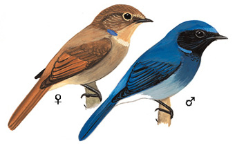 外形特征:雄性小仙鹟体色明亮,以鲜艳的蓝色为主,肩部和额部颜色最为鲜亮。雌鸟则呈棕色,具有白色的环眼圈,尾羽和翼尖呈赤褐色。体型明显小于大仙鹟,这一特征有助于与其他仙鹟种类区分开来。